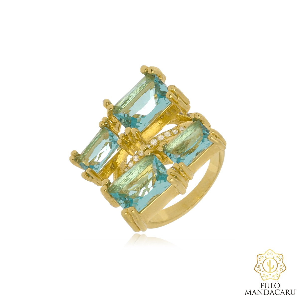 O anel Fulô Mandacaru é uma joia de presença marcante e acabamento impecável. Com design quadrado e estrutura robusta, esta peça é composta por quatro pedras água-marinha lapidadas em formato retangular, dispostas em uma formação simétrica que transmite equilíbrio e sofisticação.