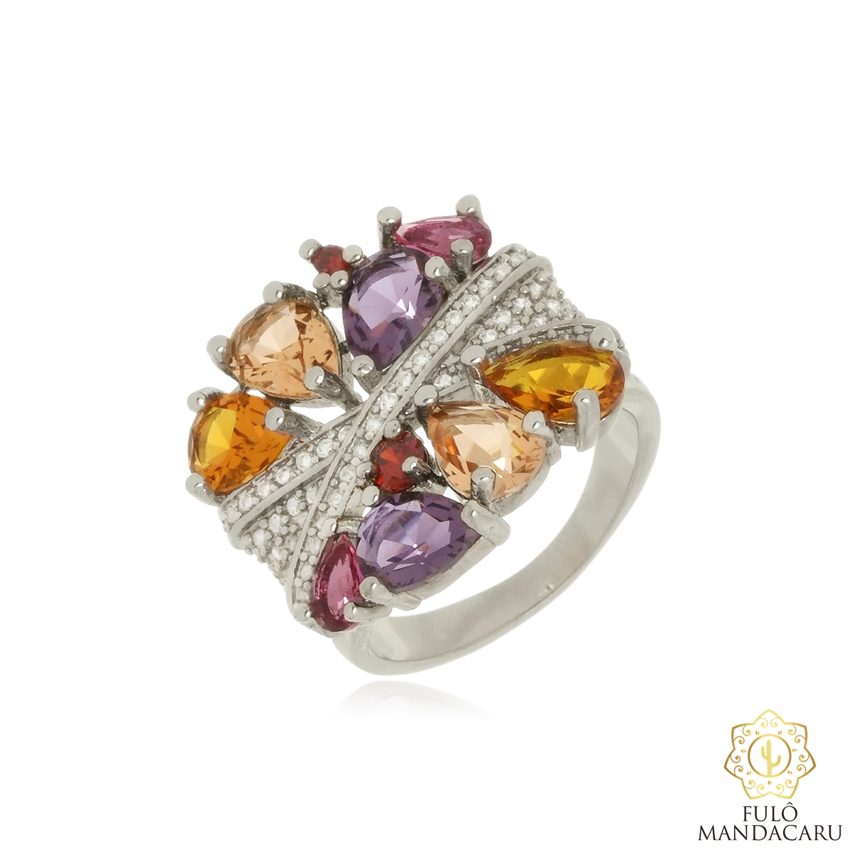 Celebre a beleza das cores com o anel exclusivo Fulô Mandacaru. Esta joia apresenta uma composição harmoniosa de pedras naturais coloridas em formatos variados, incluindo tons de laranja, roxo, amarelo, rosa e vermelho, dispostas em um design simétrico e encantador.