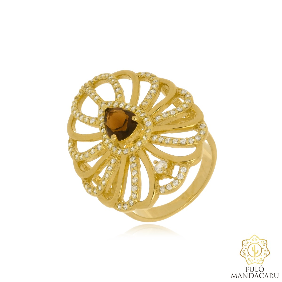 O anel Gota Fulô Mandacaru é uma semijoia de luxo com design artístico e acabamento impecável. Seu destaque é a pedra âmbar em formato de gota, envolta por um leque de zircônias cravejadas que irradiam brilho e sofisticação.