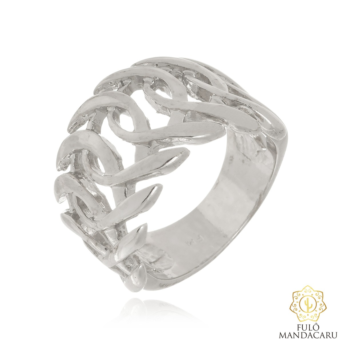 Destaque-se com o nosso Anel Largo Vazado com Elos Entrelaçados. Esta semijoia de design arrojado e moderno é banhada em Ródio Branco, um metal nobre que confere um brilho duradouro e um acabamento elegante, similar ao da Prata de Lei.