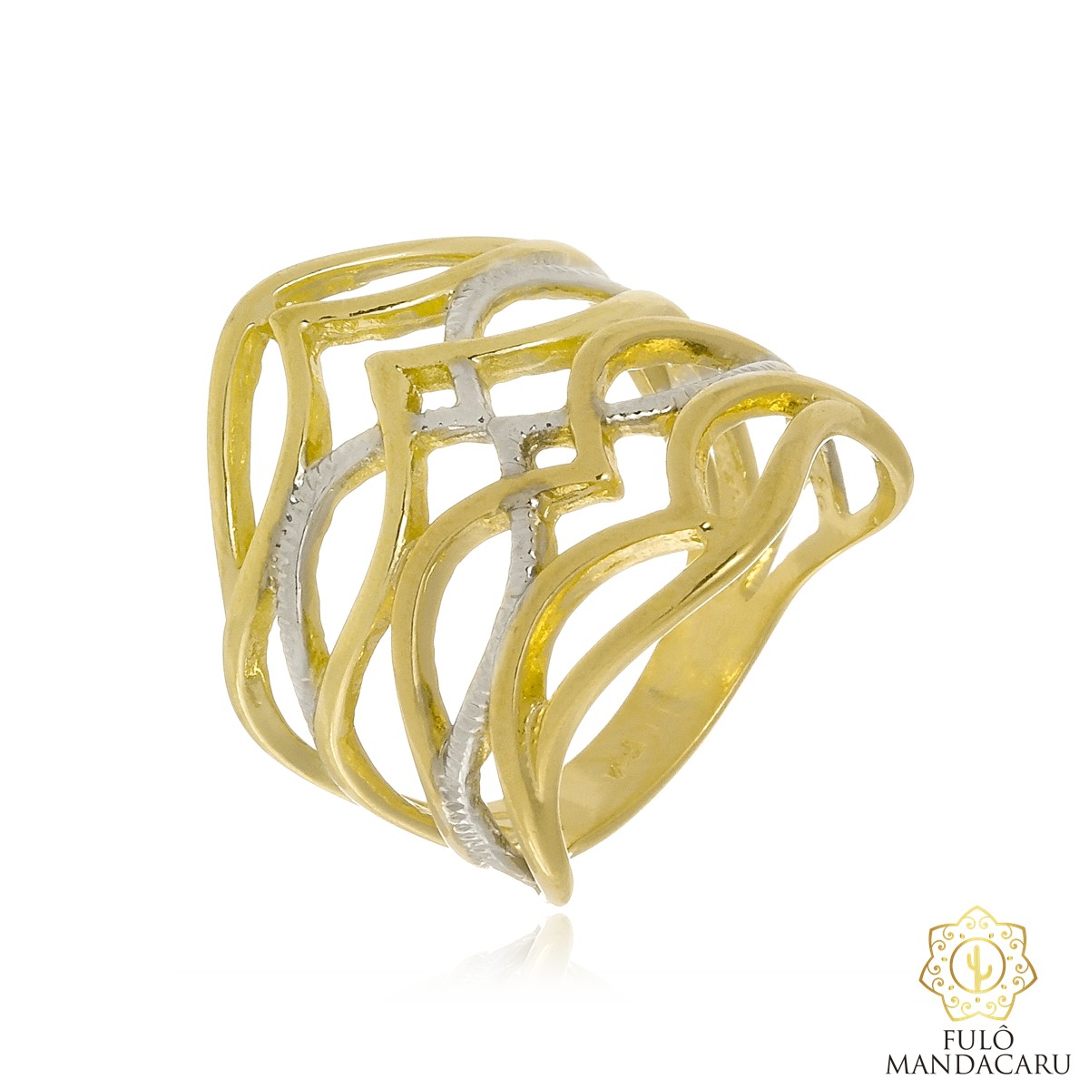 Adote um visual moderno e artístico com o Anel Largo Geométrico Vazado Bicolor. Esta peça statement é a combinação perfeita de elegância e design contemporâneo. O banho em Ouro 18k se une a detalhes em Ródio Branco (a cor prateada), criando um contraste visual dinâmico e sofisticado.