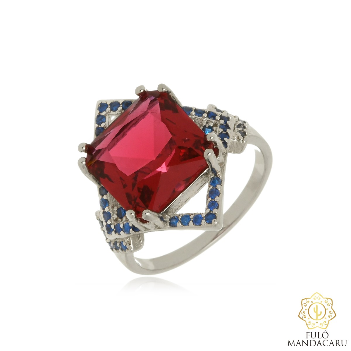 O anel Fulô Mandacaru é uma verdadeira obra de arte em joalheria. Com um design geométrico sofisticado, esta joia apresenta uma pedra central vermelha facetada em corte retangular, envolta por um aro cravejado com pedras azuis que criam contraste e profundidade visual.